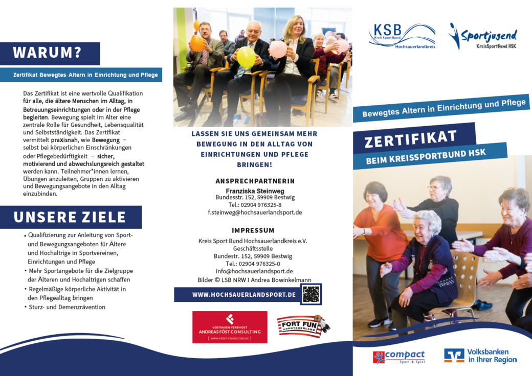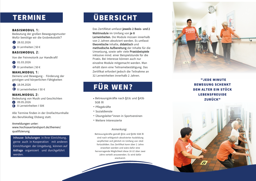 Das Zertifikat ist eine wertvolle Qualifikation für alle, die ältere Menschen im Alltag, in Betreuungseinrichtungen oder in der Pflege begleiten. Bewegung spielt im Alter eine zentrale Rolle für Gesundheit, Lebensqualität und Selbstständigkeit. Das Zertifikat vermittelt praxisnah, wie Bewegung – selbst bei körperlichen Einschränkungen oder Pflegebedürftigkeit – sicher, motivierend und abwechslungsreich gestaltet werden kann. Teilnehmer*innen lernen, Übungen anzuleiten, Gruppen zu aktivieren und Bewegungsangebote in den Alltag einzubinden.