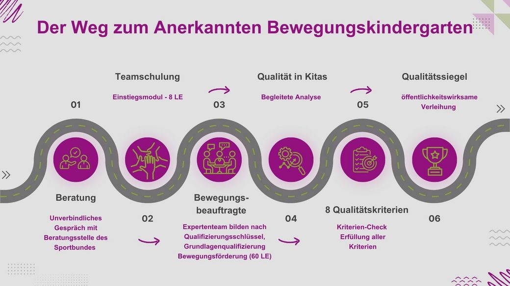 Der Schwerpunkt Bewegungsförderung wird im pädagogischen Konzept Ihrer Kindertageseinrichtung durch den Träger, das pädagogische Personal und den Elternrat verankert. Das Konzept ist die Visitenkarte ihrer Einrichtung. Gerne stellen wir Ihnen eine Orientierungshilfe zur Verfügung.