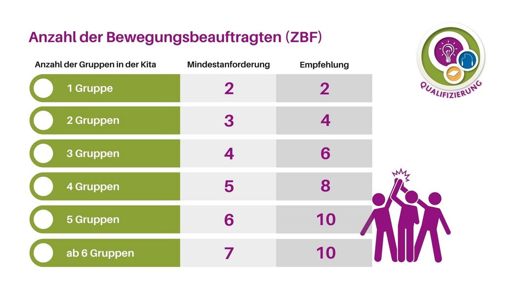 Je nach Gruppenanzahl legt die Kita Bewegungsbeauftrage fest. Die Bewegungsbeauftragten müssen das Zertifikat "Bewegungsförderung in Sportverein und Kita" vorweisen. Es besteht die Möglichkeit andere Ausbildungen ebenfalls anzuerkennen. Sprechen Sie uns hierzu an!