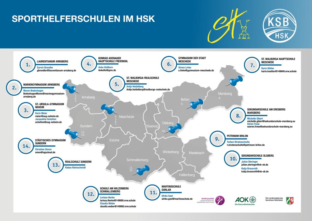 Die Sporthelfer-Landkarte zeigt euch alle Sporthelfer-Schulen im HSK und deren Ansprechpartner*innen.